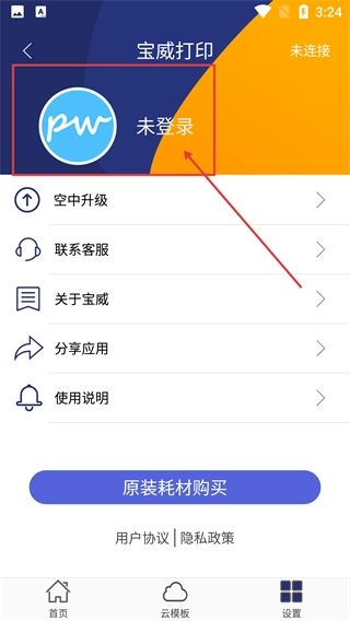 2、进入设置页后,点击顶部【未登录】区域,可跳转至登录界面,该页面包含空中升级、客服等功能入口。