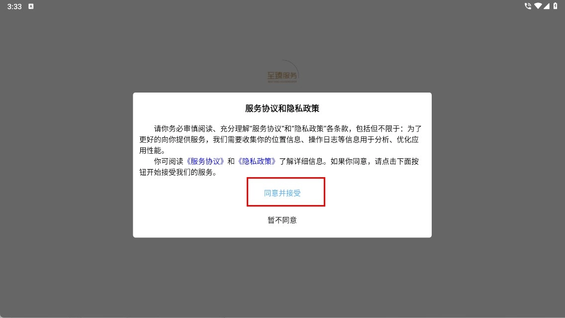 在服务协议与隐私政策页面,点击【同意并接受】按钮,即可进入登录或注册流程。