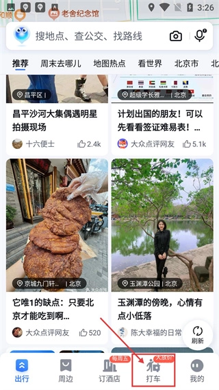 1、打开百度地图主界面后,点击底部的【打车】选项就能进入打车专区,在这里可以使用即时打车、顺风车等各类出行服务。
