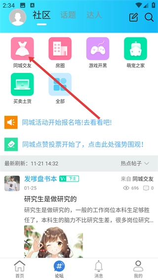2、在社区页面,点击【同城交友】分类,进入同城交友板块。