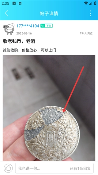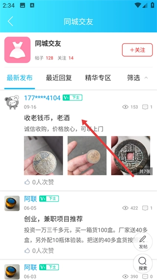 3、在同城交友板块里,挑选目标帖子(例如“收老钱币、老酒”这类),点击进入帖子的详情页面。