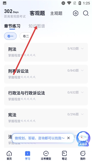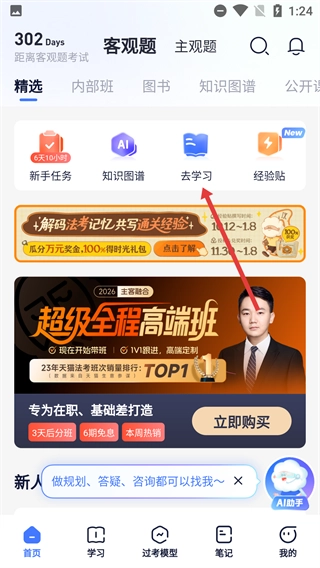 1、在首页点击【去学习】按钮,进入学习板块,开启法考知识学习流程。