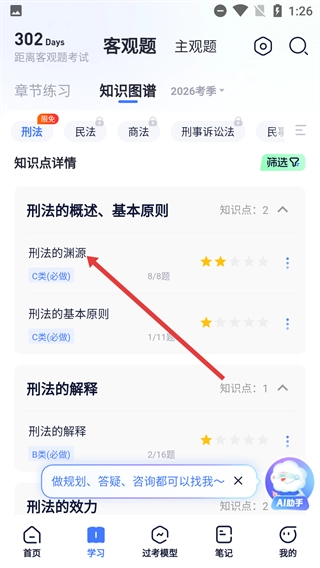 3、在知识图谱页面选择【刑法的渊源】知识点,进入该知识点的强化练习环节。