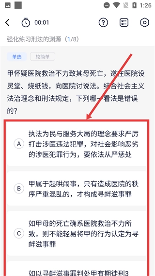 4、在知识点练习页面,可查看题目选项(如A、B、C等),进行法考题目练习,巩固知识点。
