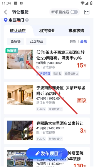 2、在【转让租赁】页面的酒店列表中,点击目标酒店项目(如【低价!茶店子西宸天街酒店转让】),进入其详情页面。