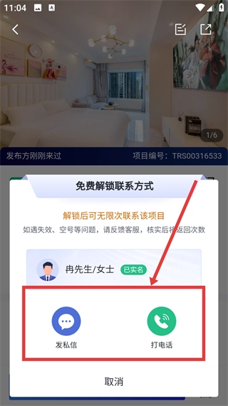 4、在弹出的【免费解锁联系方式】窗口中,选择【发私信】或【打电话】方式,与发布人取得联系。