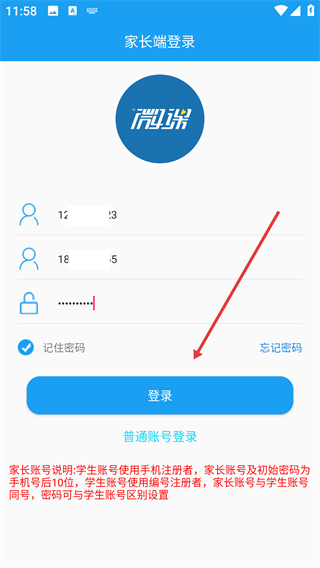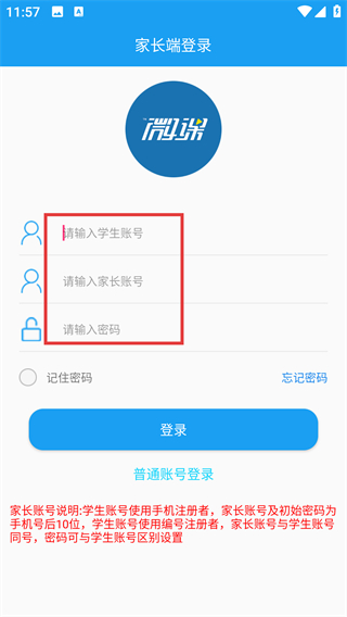 3、在家长端的登录界面中,依次输入学生账号、家长账号以及密码。