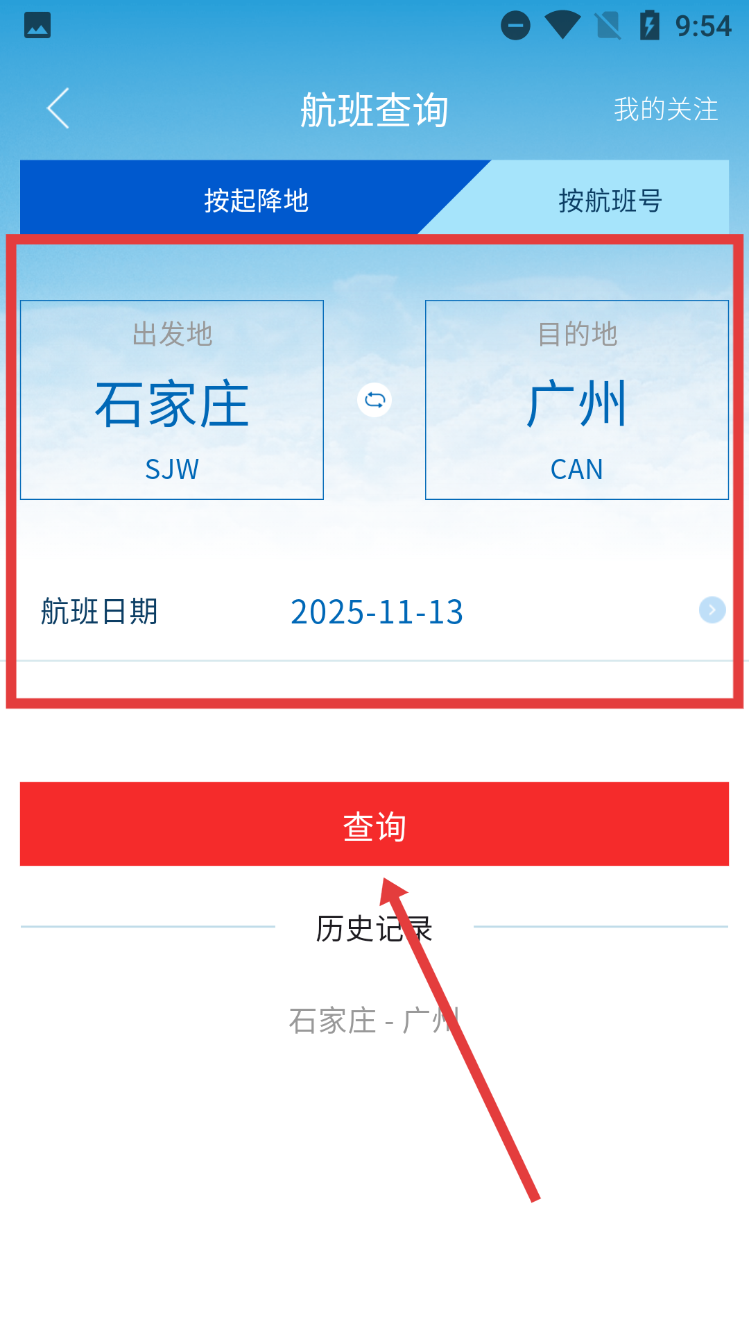 2、在航班查询页面,选择【按起降地】,填写【出发地】【目的地】【航班日期】后,点击【查询】获取航班信息。