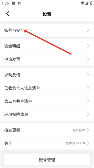 3、进入设置页面后,点击【账号与安全】选项,即可进入账号安全管理页面。