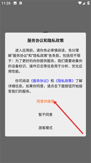 在应用启动时弹出的【服务协议和隐私政策】提示框中,需要仔细阅读相关内容后点击【同意并接受】按钮,这样才能进入应用使用各项服务。