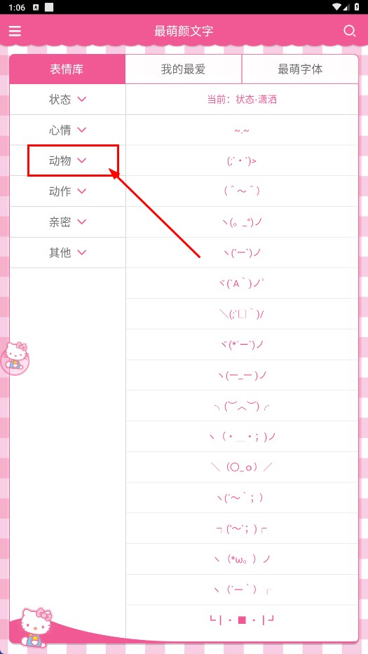 2、在主界面找到并点击【动物-分类标签】,即可展开动物类颜文字的分类列表。
