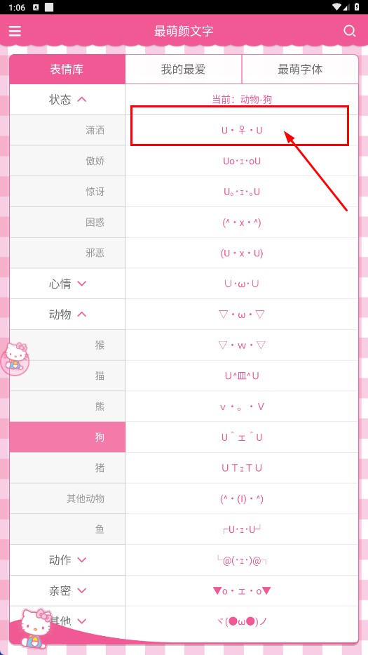 4、在狗类颜文字列表中,你可以挑选像“U・♀・U”这类颜文字来使用,点击对应的颜文字就能完成复制,之后就可以粘贴到需要的地方啦。