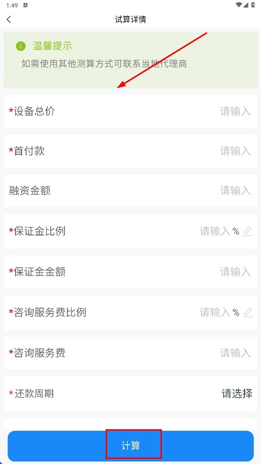 3、在试算详情页面填写设备总价、首付款等信息后,点击【计算】功能按钮。