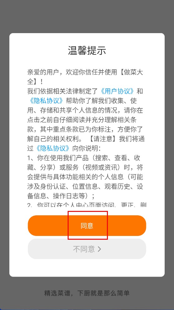 1、点击【同意-功能按钮】,进入做菜大全首页。