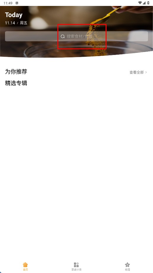2、在首页找到并点击【搜索食材/菜谱-搜索框】,即可进入搜索页面。
