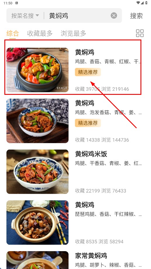 4、在搜索结果里找到【黄焖鸡-菜谱选项】并点击,查看这个菜谱的详细内容。