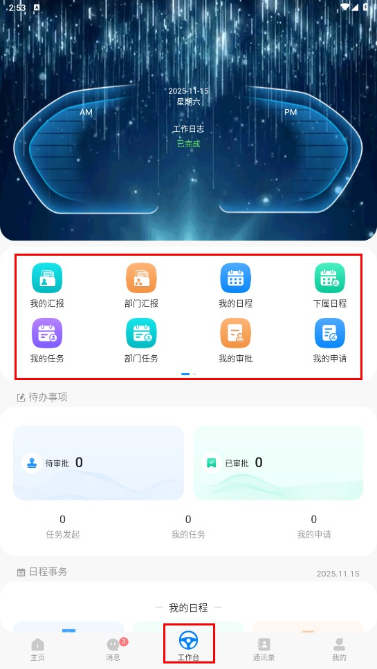 3、点击底部【工作台-功能按钮】,进入工作台页面,可选择我的汇报、部门汇报、我的日程等功能模块。
