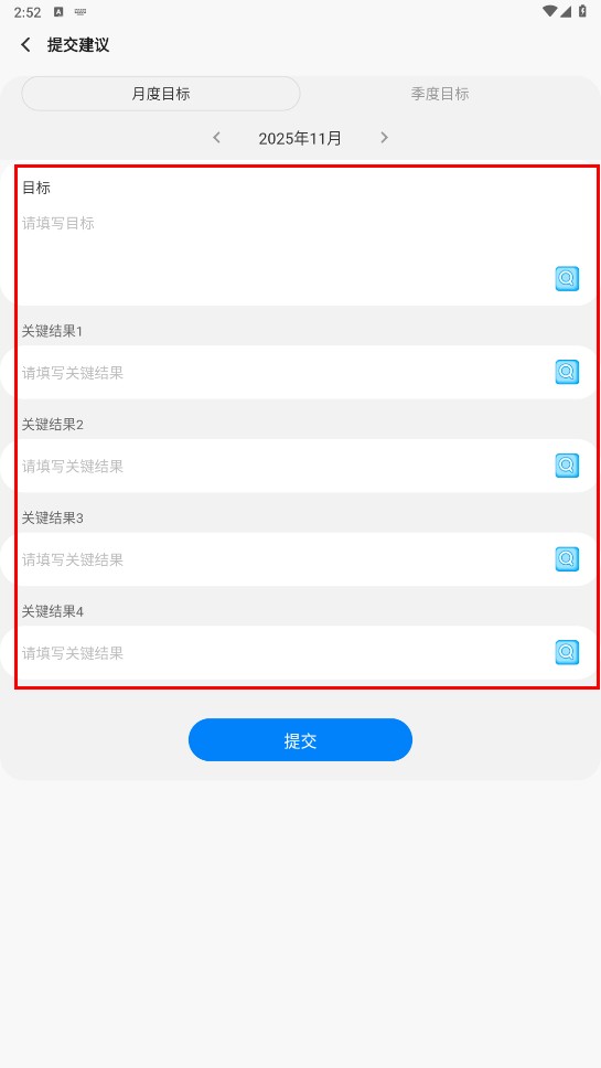 2、在提交建议页面,填写目标和关键结果后,点击【提交-功能按钮】。