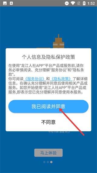 2、阅读【个人信息及隐私保护政策】,点击【我已阅读并同意】,确认使用龙江人社服务。