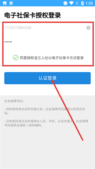 4、在电子社保卡授权登录页,填写信息并同意授权后,点击【认证登录】,完成电子社保卡登录操作。