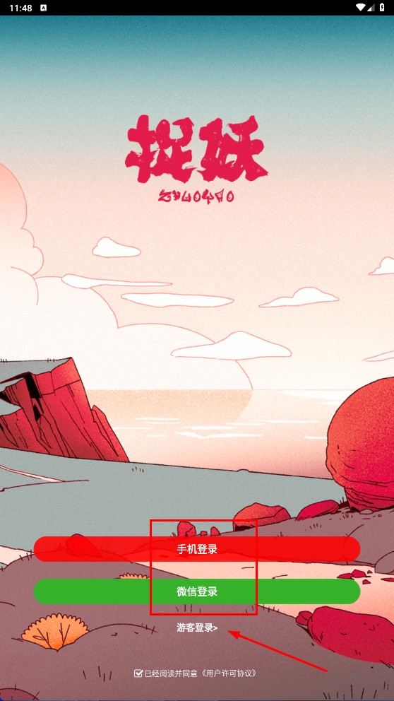 1、可选择【手机登录】【微信登录】或【游客登录】方式进入“捉妖”应用。