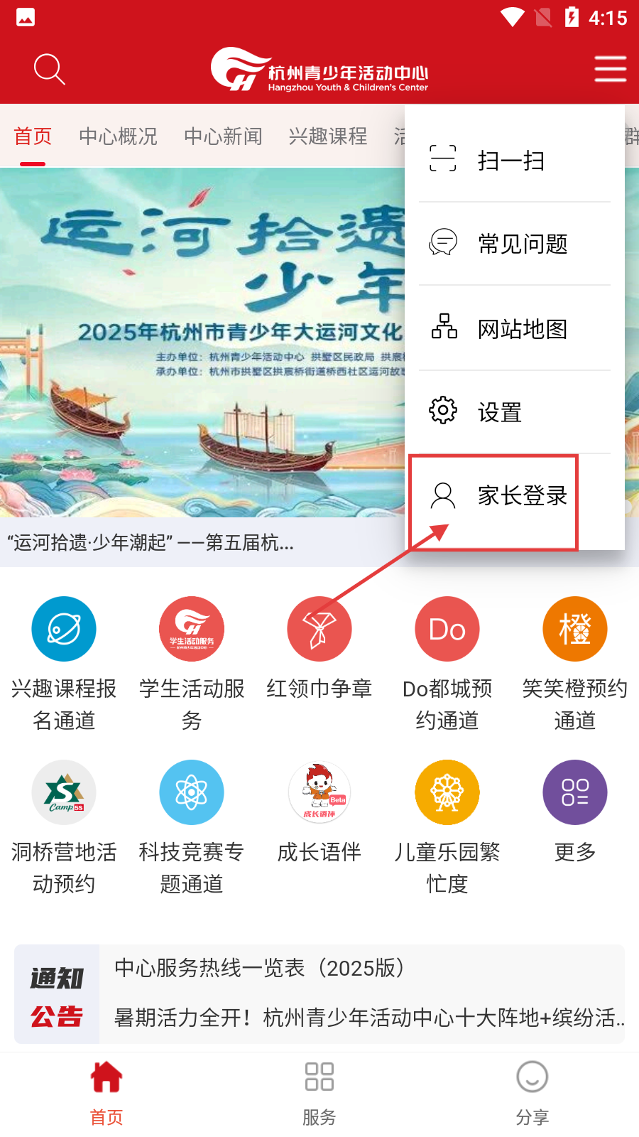 2、在打开的菜单里点击【家长登录】选项,即可进入登录界面。