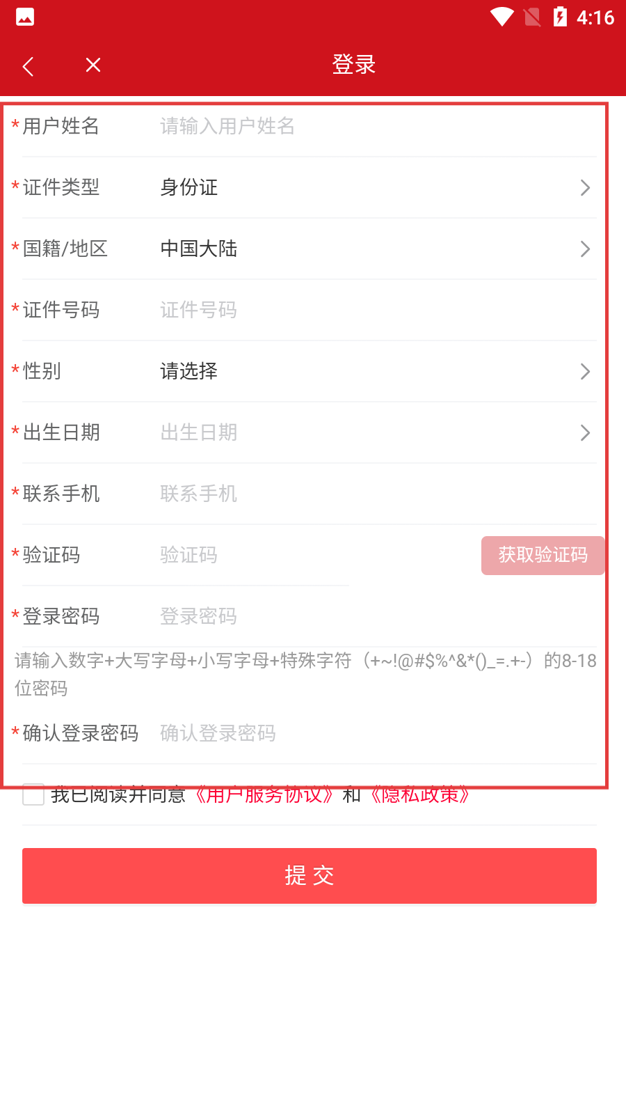 4、进入注册页面后,按顺序填写用户姓名、证件类型、国籍/地区、证件号码等相关信息,随后点击【提交】按钮,即可完成注册流程。