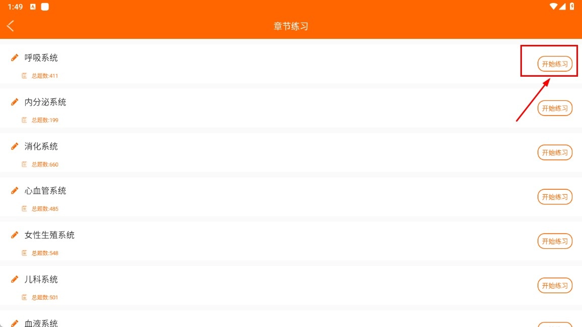 4、进入章节练习,点击【开始练习-按钮】,进行呼吸系统等章节的习题练习。