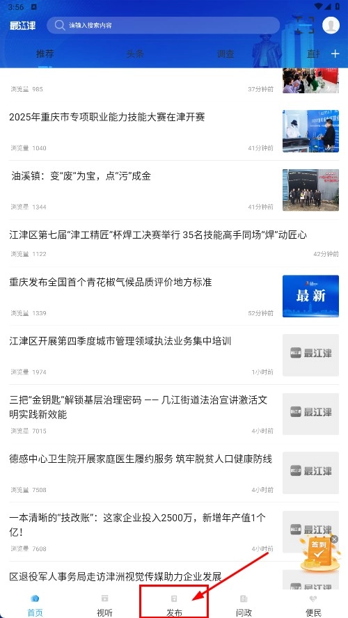 1、点击底部【发布】按钮,进入【津友圈】,可查看、发布动态,参与社区互动。