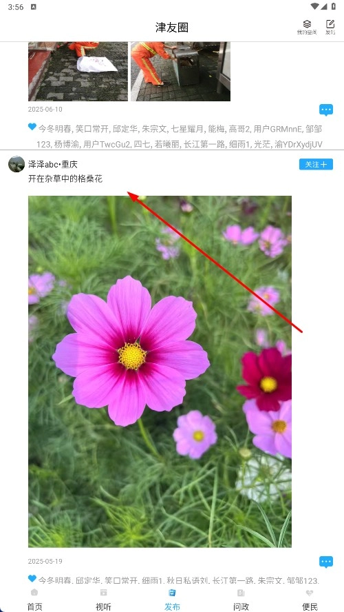 2、在【津友圈】,可浏览用户动态,如【泽泽abo-重庆】分享的格桑花图片及互动。