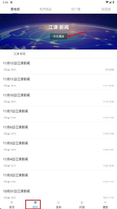 4、点击底部【视听】按钮,进入新闻页,播放【江津-新闻】,浏览多日期新闻及相关信息。