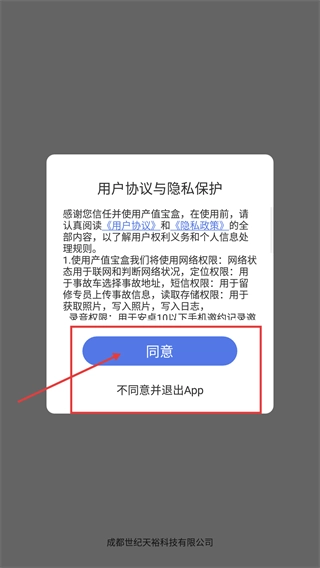 1、打开【产值宝盒】后,点击【同意】按钮就能继续使用应用,要是选择【不同意并退出App】就无法进入。