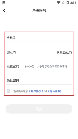 3、进入【注册账号】页面后,需要填写【手机号】,获取并输入对应的【验证码】,接着设置8至20位、同时包含大小写字母、数字与特殊字符的密码,且需再次确认该密码。
