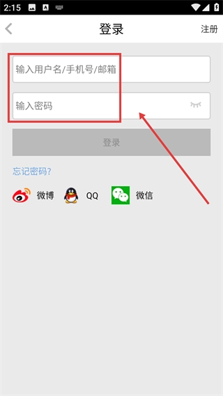 3、在登录页面输入用户名/手机号/邮箱和密码。