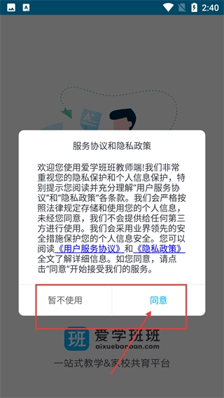 1、使用【爱学班班教师端】前,该平台是一站式教学&家校共育平台,承诺依法保护个人信息;点击【同意】按钮即可进入应用。