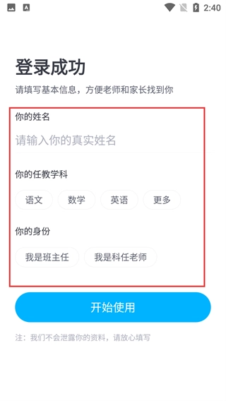 3、登录成功后,需填写【真实姓名】,选择【任教学科】和【身份】(班主任/科任老师),完成后点击【开始使用】。
