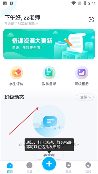 4、进入主界面后,可使用“学生评价”“教学备课”“班级相册”等功能,通过底部“+”按钮发布通知、打卡等班级动态。
