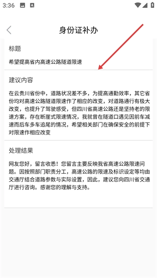 4、在建议详情页面能够查看建议的标题、内容以及处理结果等详细信息。
