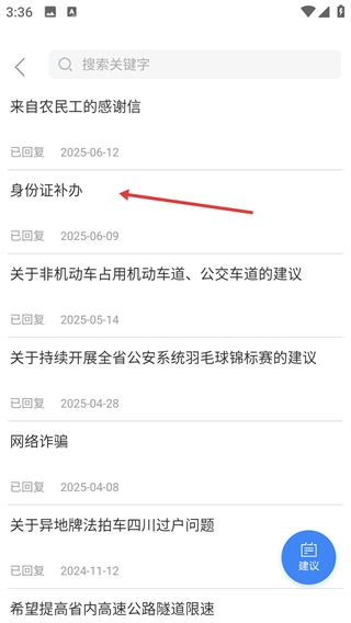 3、在建议列表页面找到并点击【身份证补办】选项,即可进入该建议的详情页面。