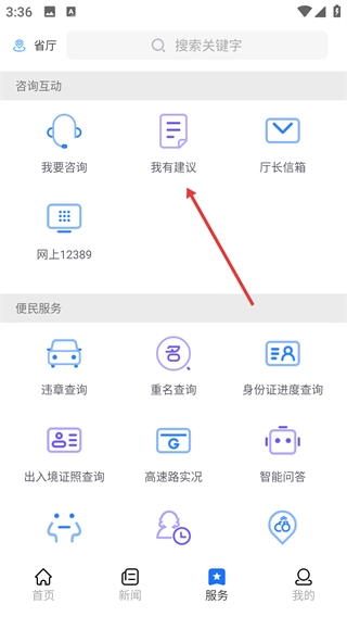 2、在服务页面的咨询互动板块里,点击【我有建议】选项,即可进入建议列表页面。