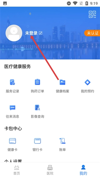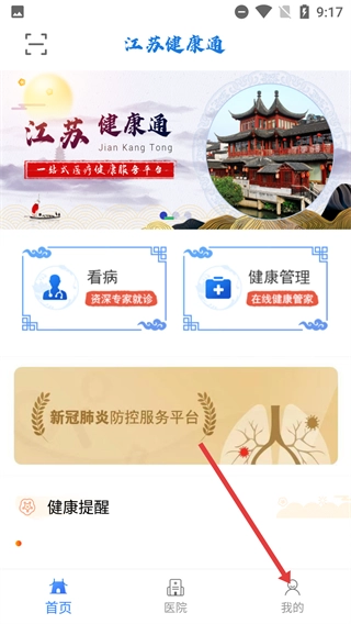 1、打开【江苏健康通】,在首页底部点击【我的】,进入个人页面以使用更多医疗健康服务。