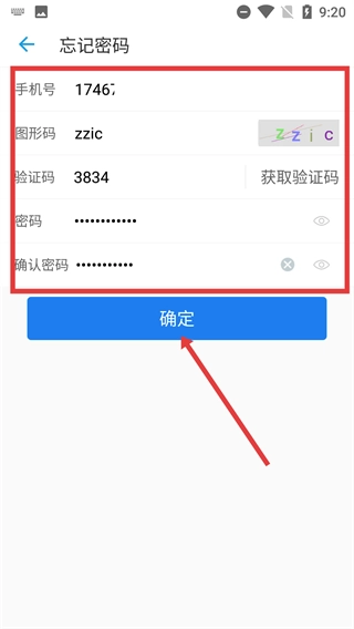 4、在忘记密码页面,依次填写【手机号】【图形码】【验证码】并设置新密码,确认后点击【确定】完成密码重置。