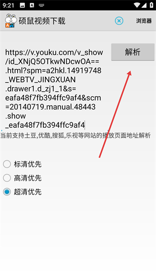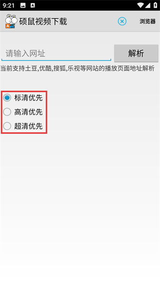 2、在网址输入页面选择视频清晰度优先级,如【超清优先】。
