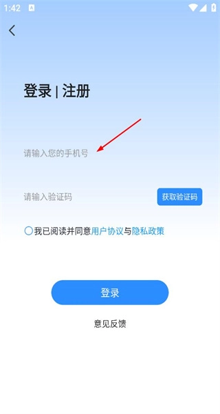 3、在登录注册界面,输入手机号,获取并填写验证码,勾选用户协议后点击登录,完成账号登录流程。