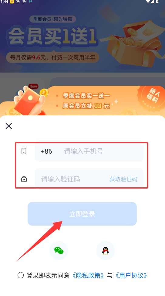 1. 打开应用,可选择手机号验证,也能选择微信/QQ快捷登录,新用户要完成基础注册流程。