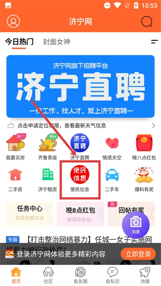 1、打开【济宁网】首页,找到并点击【便民信息】选项,进入同城信息相关的操作界面。