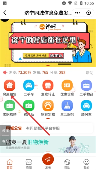 2、打开【济宁同城信息】页面,点击【房屋租售】功能入口,进入对应的房屋信息服务板块。
