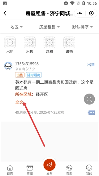 3、进入【房屋租售-济宁同城】页面后,找到目标房源并点击其【全文】选项,即可查看该房屋的详细信息。