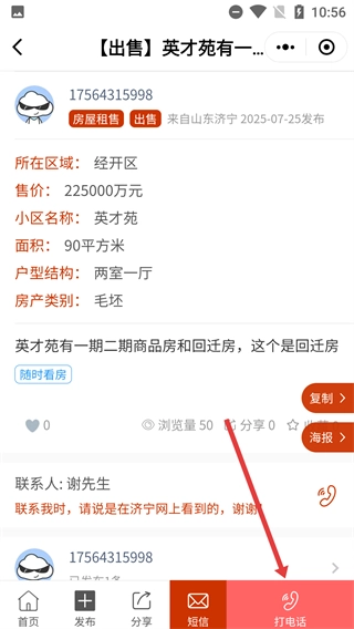4、进入房源详情页后,点击底部的【打电话】按钮,就能联系到该房屋信息对应的联系人,咨询相关详情。