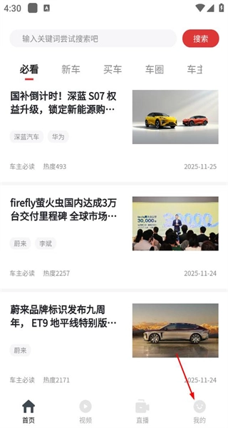 打开软件后,先进入首页浏览必看等类别的汽车资讯,再点击底部的“我的”选项,即可进入个人中心页面。